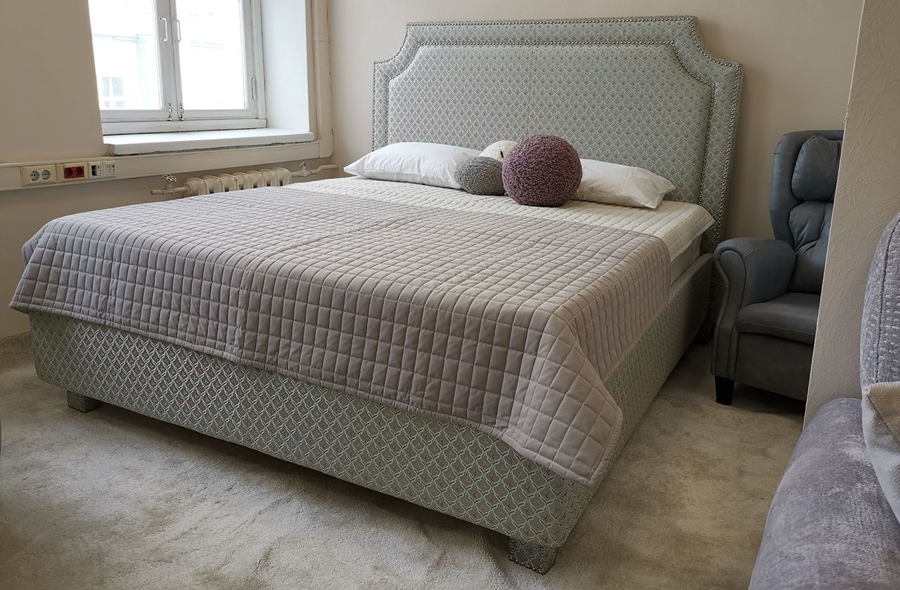 Мягкая, уютная кровать «Дженифер» подходит для ценителей традиционного стиля. Особый шарм этой модели придают высокая фигурная спинка с отделкой декоративными гвоздиками, а также эксклюзивная шелковистая ткань, используемая для обтяжки царги, спинки и ножек изделия.